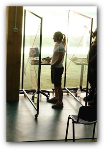 Le 25m se passe comme prévu : Une très bonne précision (293/300) et une vitesse inconstante (98 95 93) qui me donne un total de 286, soit 579/600 à quelques points de la finale.