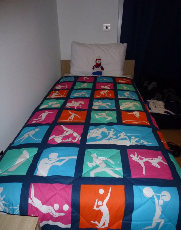 Nous sommes bien logés, la chambre que je partage avec Emilie Evesque (ça me rappelle l’INSEP !) est agréable, avec un balcon et une belle vue ! Le village est accueillant, très coloré avec les drapeaux de toutes les nations.